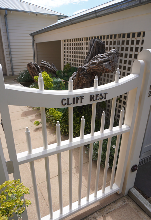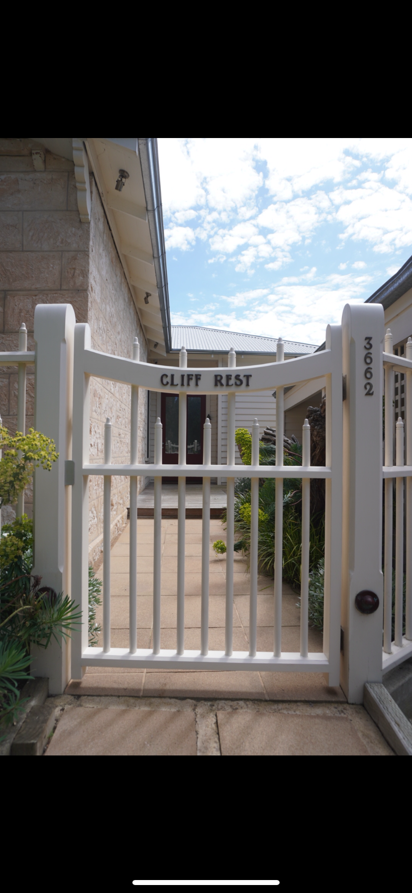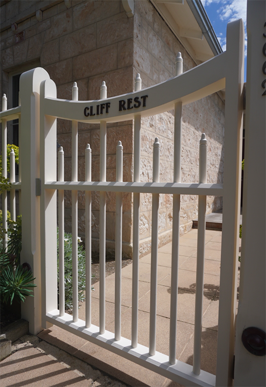 Recently completed heritage gate restoration. We absolutely love custom woodwork projects like this one. The curved top section was milled and shaped from a solid 210x180mm piece of Turpentine hardwood, with the round pickets dowelled through to run continuously across the gate.