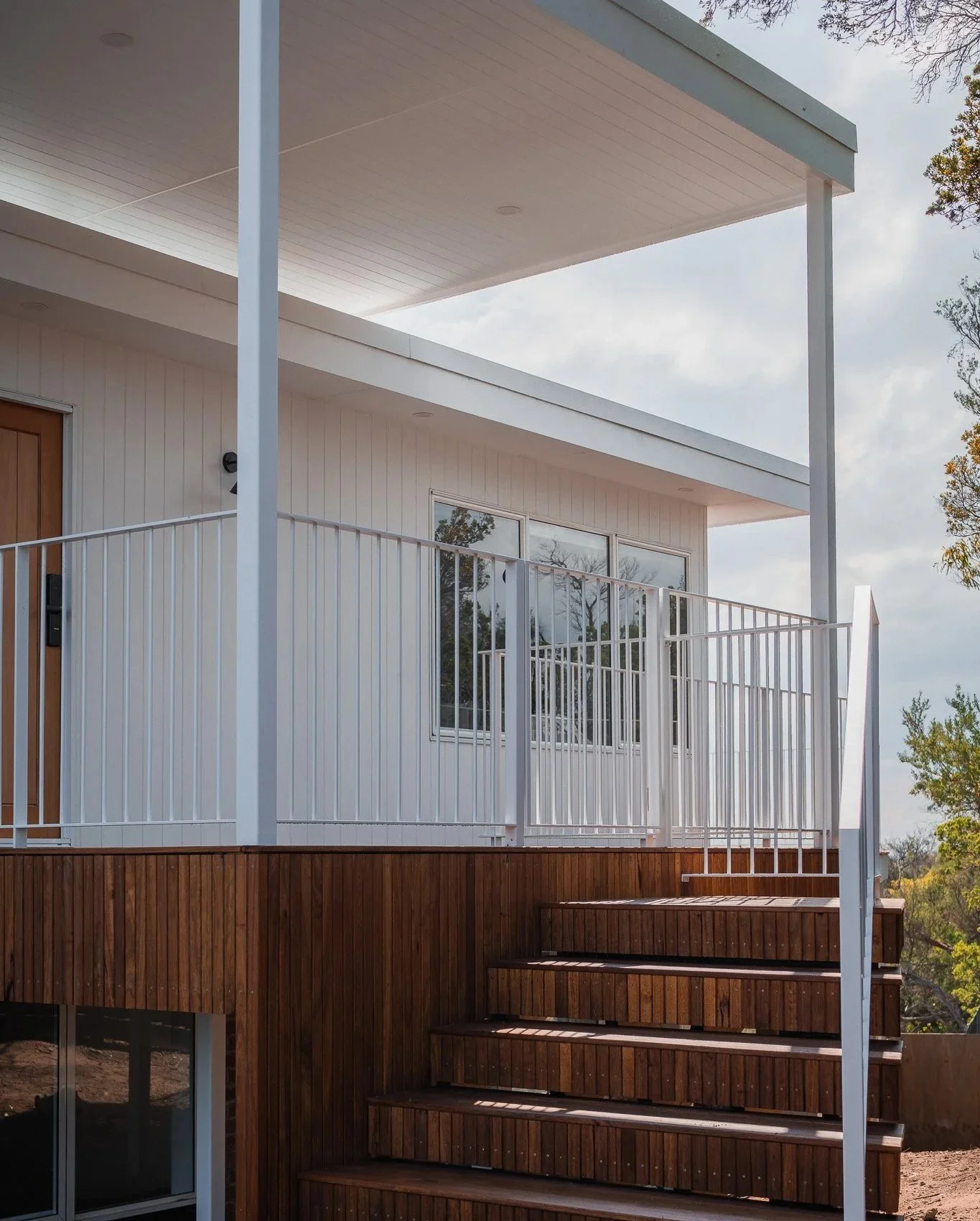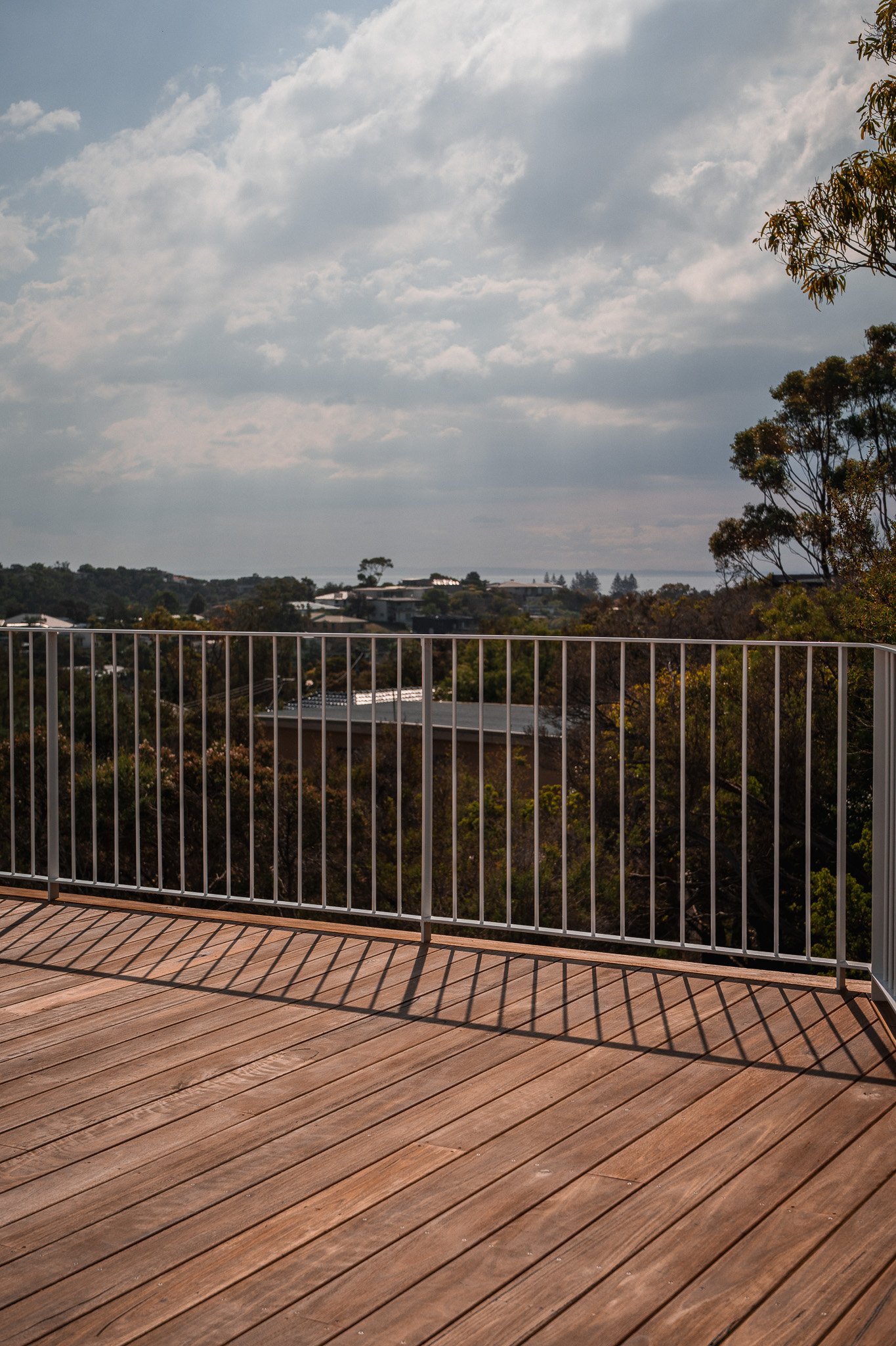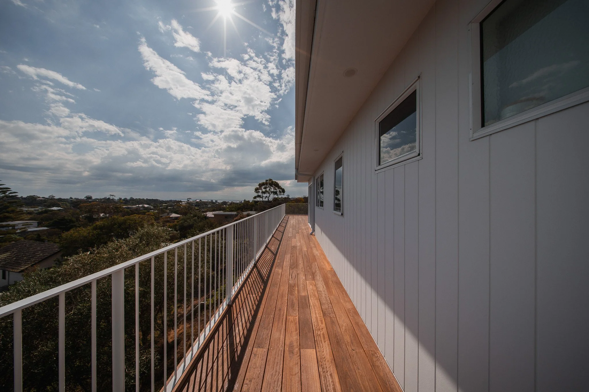 Nearing completion! Our Rye project is coming to a close, with this recently completed deck & alfresco showcasing premium Blackbutt timber, a custom powder-coated stainless steel balustrade built for coastal durability and a striking floating staircase.
