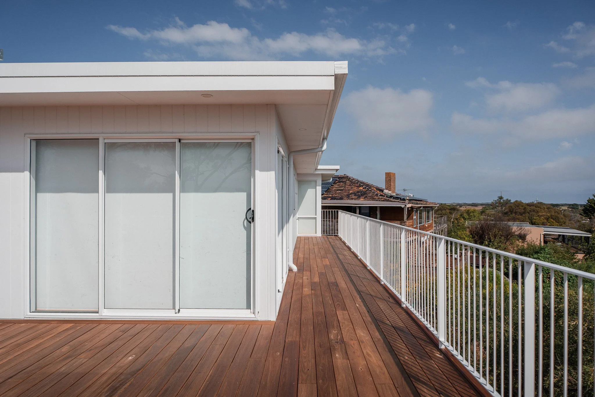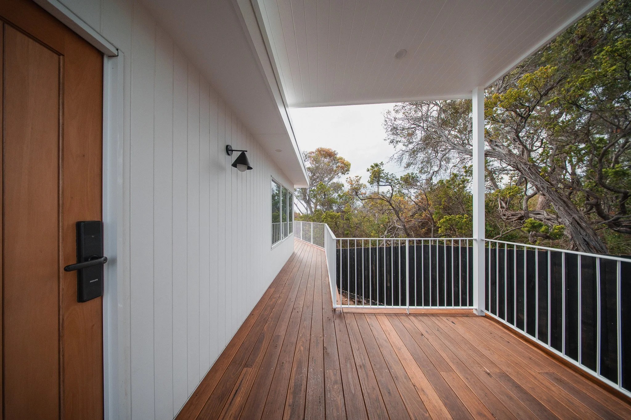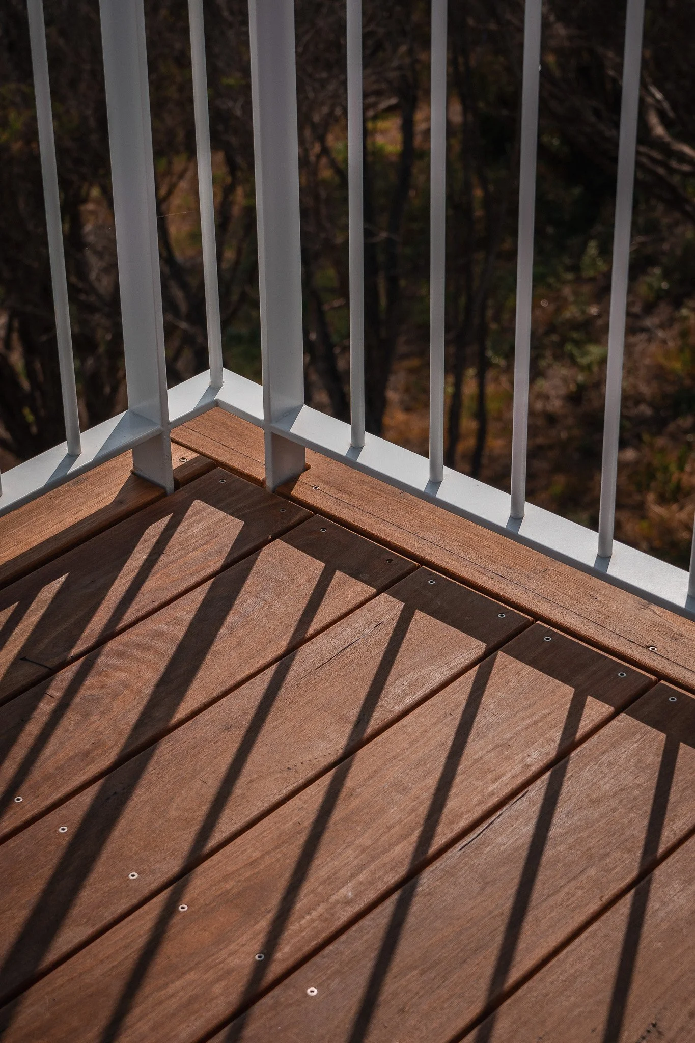 Nearing completion! Our Rye project is coming to a close, with this recently completed deck & alfresco showcasing premium Blackbutt timber, a custom powder-coated stainless steel balustrade built for coastal durability and a striking floating staircase.